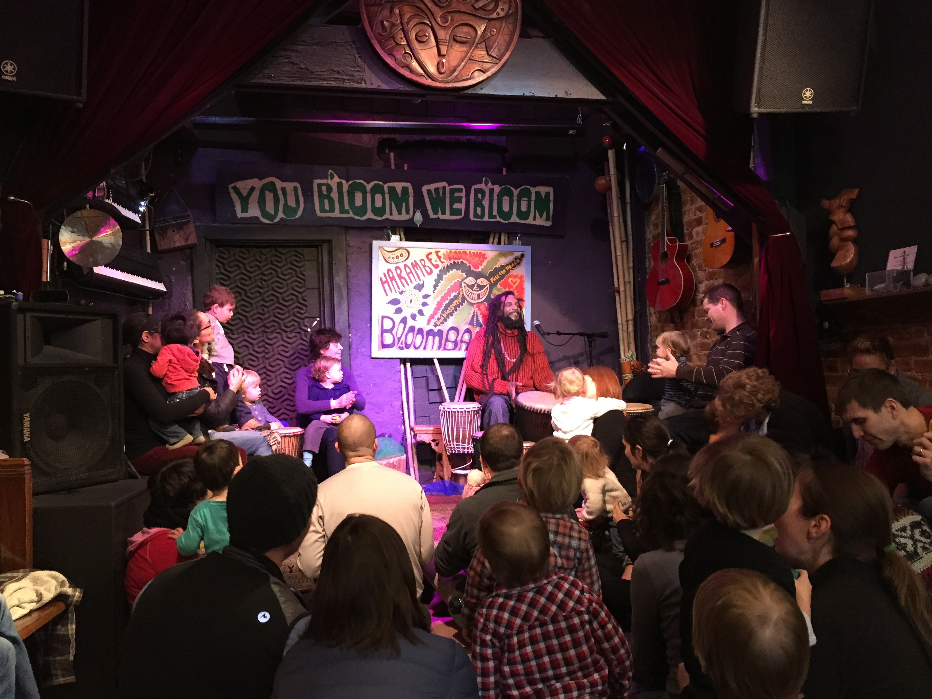 Most of the children have a shaker or tambourine in their hand and about half the people are singing along with Baba Ras. The class is called Harambee, which means “pull together” in Swahili, and on his website Baba Ras describes his creation as a “practice of hope, possibility and compassion.” We’ve only been here a couple of times and Dubsie is still a little stunned by the noise and the abundance of children, and the guitars and keyboards hung on the walls, and the half a boat hanging from the ceiling (that’s the DJ booth), and especially the big ecstatic black man with the dreadlocks and beard.