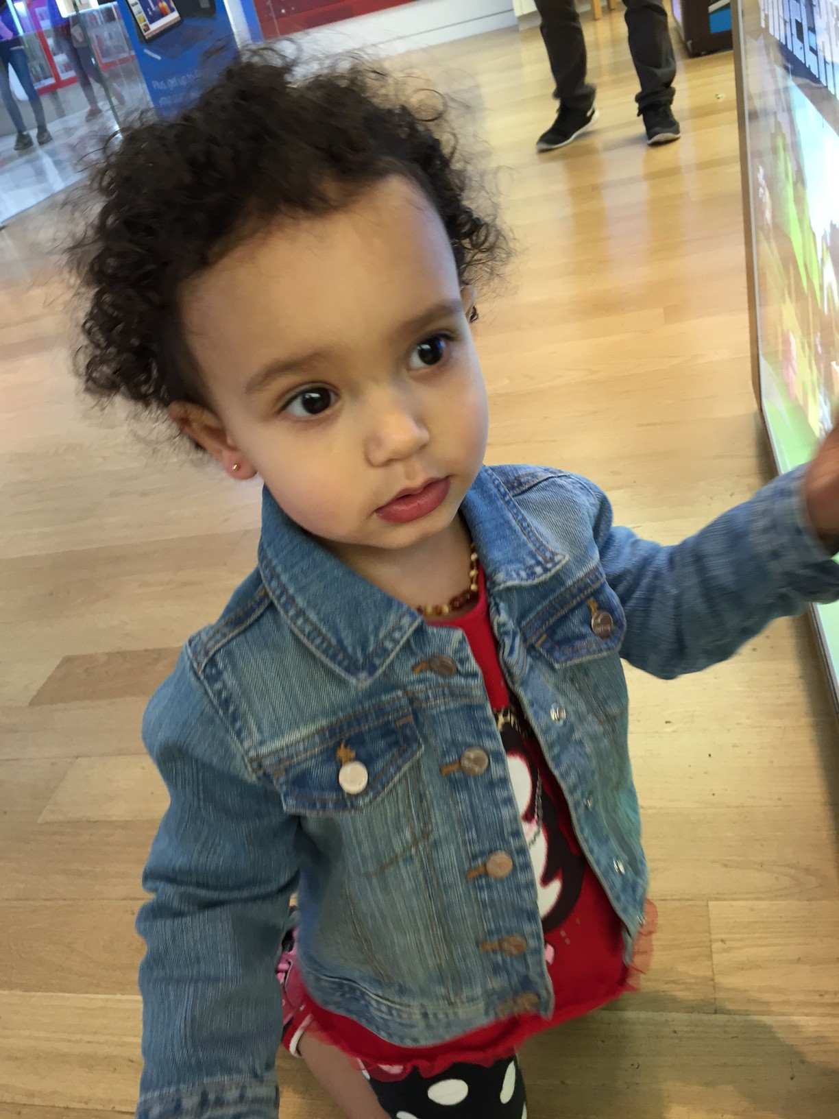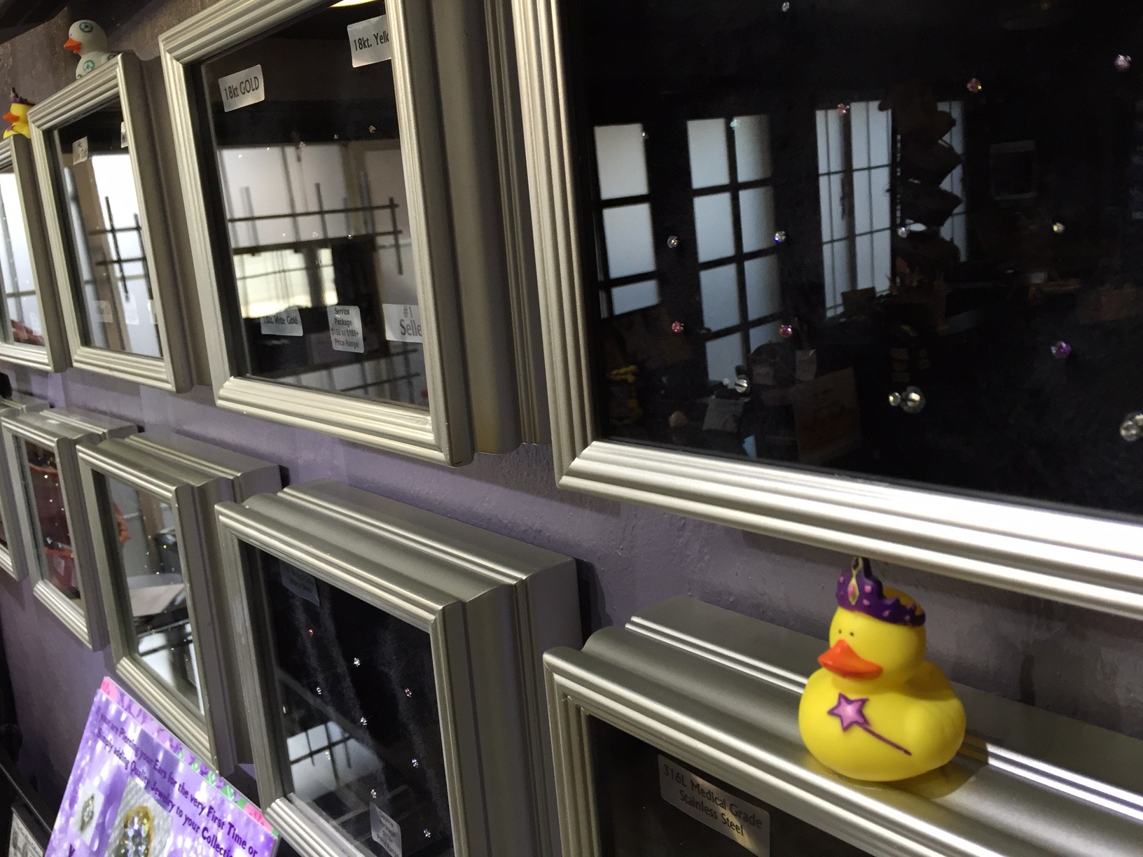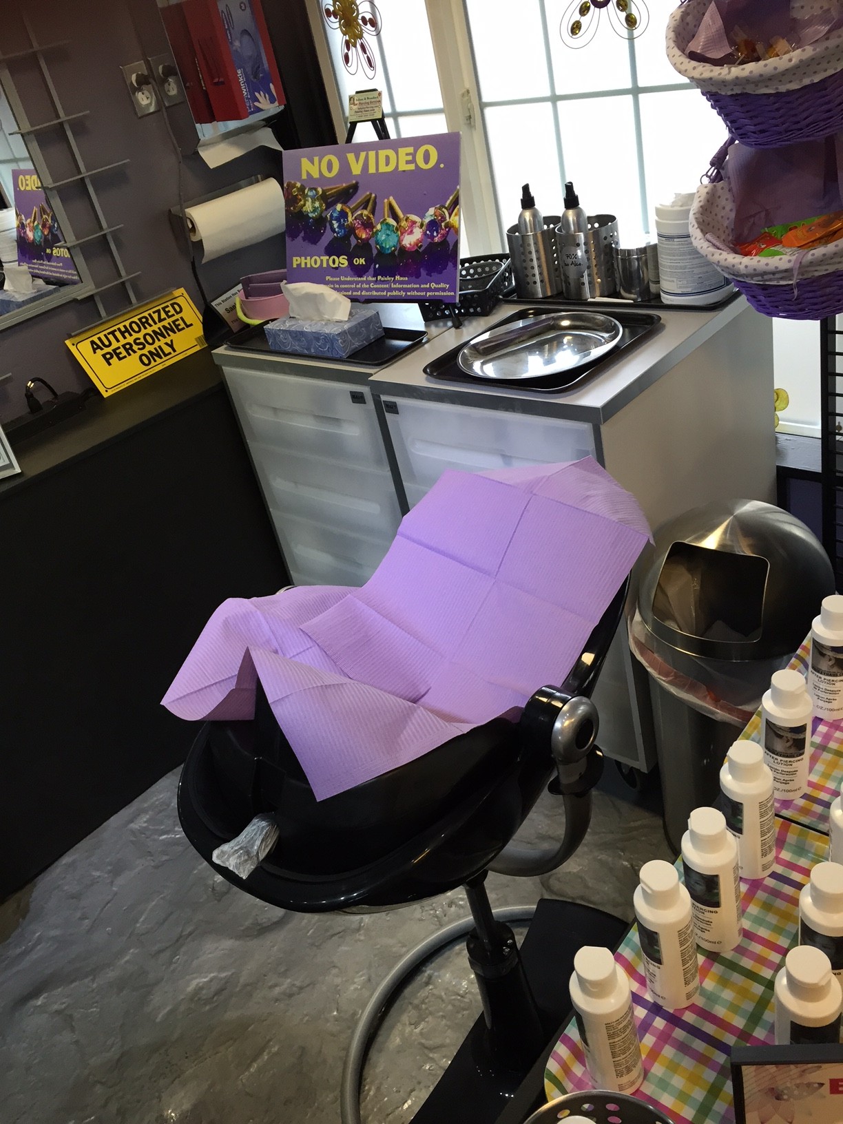 The walls are lavender. Little glass cases display a child’s assortment of ear jewelry, twinkly but too blunt to be tug-tug-tugged by tubby fingers. Studs in silver and gold, and hoops, and stones for every birth month. The little girl skitters across the slate floor and peers for a moment into display cases, then staggers over to look at a funhouse reflection of herself in a wall that is made up entirely of mirror shards. Next to a case of lotions and potions is a tiny sink and two half-eggshell chairs on silver posts, each with a diminutive purple coverlet.