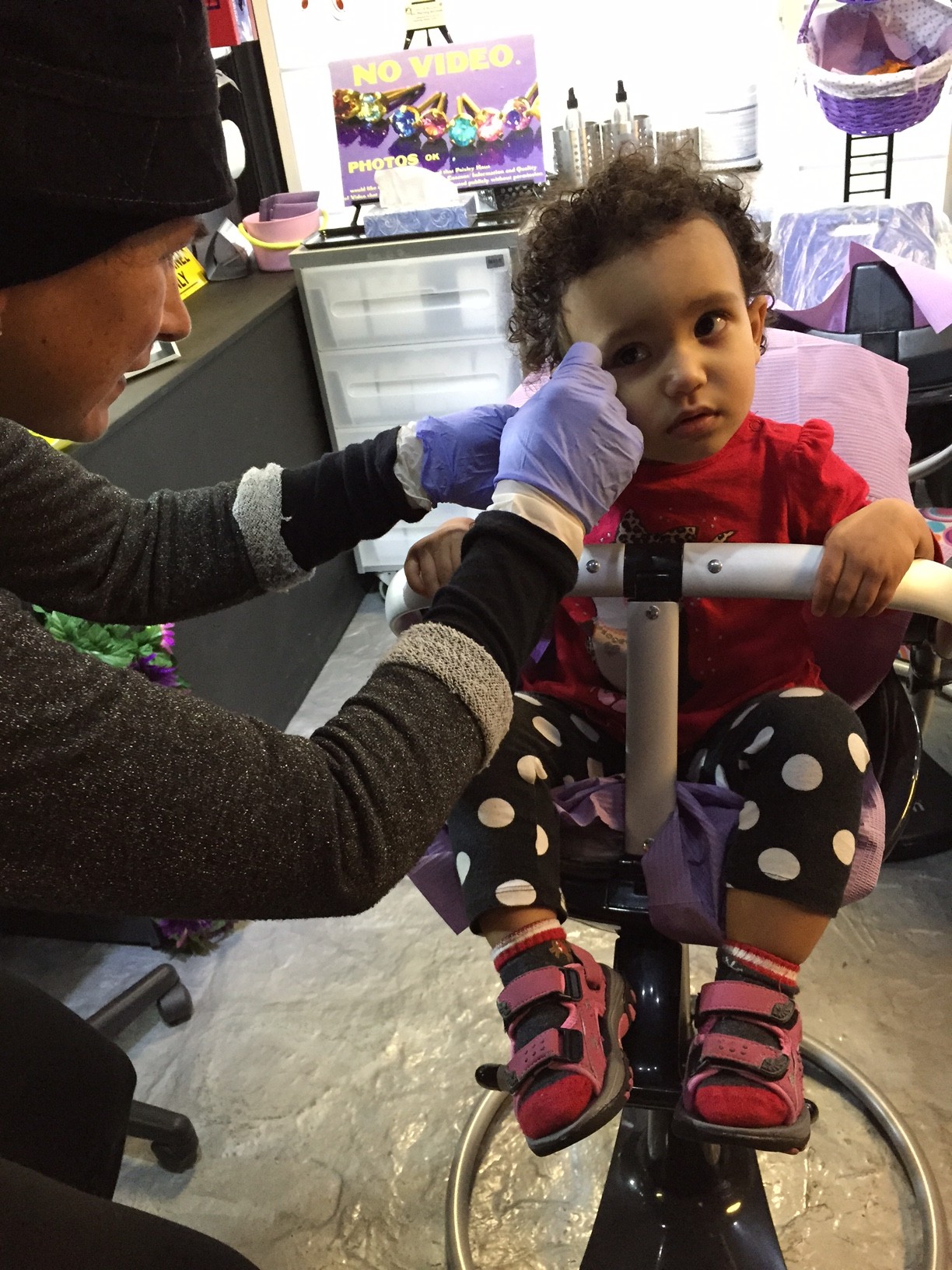 Little girls get upset at the markings, Angel says, looking warily at both the girl and her mother. But the mother is strangely calm for a mother, and the little girl isn’t unhappy. Bewildered at finding herself in a dentist’s chair at Lavender-Land, but not fussing.