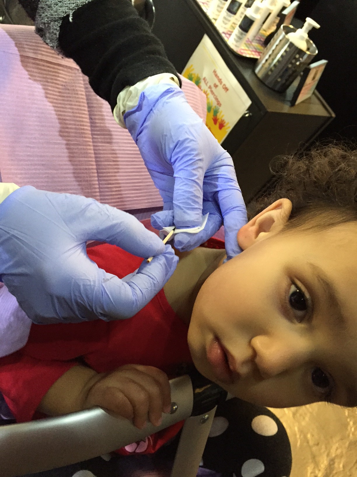 The little girl is whisked off the floor and placed in the chair. Angel dons a pair of lavender surgical gloves and dips a toothpick in ink. She marks one earlobe dead center. Her right earlobe is wider than her left, she remarks.